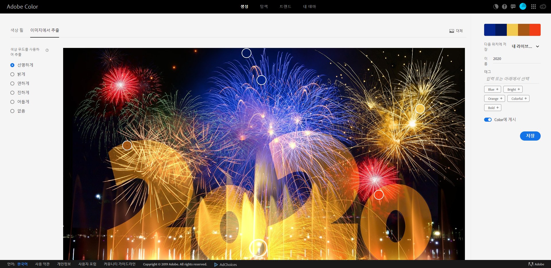 만약 사진이 없다면 Adobe Color 트랜트(https://color.adobe.com/ko/trends)에 가서 자주쓰는 트렌드 컬러에 대해서도 알 수 있습니다.